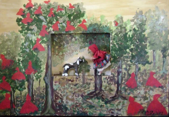 Caperucita Roja era una niña curiosa. Un buen día se encontró con el lobo feroz y se sentó a charlar con él. Pasaron horas y horas, tantas que todas las caperucitas que habían sido infinitamente contadas comenzaron a aparecer para avisarle de su error “así no es el cuento” le gritaban. Pero ella, absorta en la conversación, no pudo escucharlas; tampoco el lobo que estaba con la oreja atenta y el ánimo relajado. Aparecieron más y más caperucitas hasta formar el cuento de “Éranse unas caperucitas rojas perplejas y envidiosas” que fue contado y contado por siempre jamás.